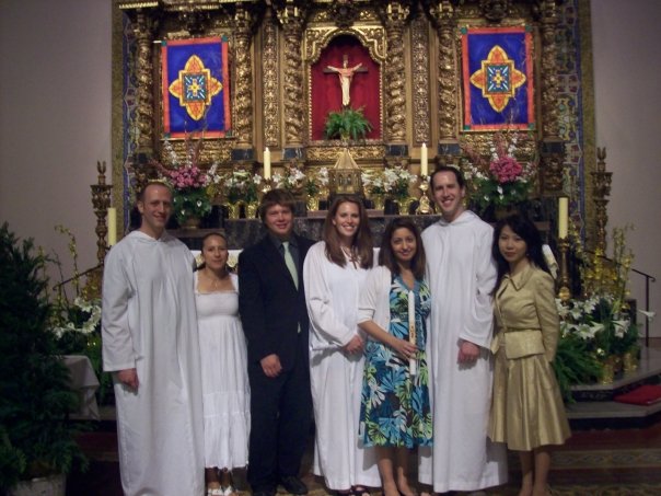 I was immediately attracted to Saint Timothy church because of its aesthetics. I’m sure some students of architecture will call this next comment ignorant or at least inaccurate, but the outside of Saint Timothy’s looks, to me, like it wouldn’t be totally out of place on a Spanish mission. Although the building itself, finished in the 1940s, is not especially old, relatively speaking, some of the artwork inside is. For example, the altarpiece, originally from Spain, may be a few hundred years old. (It’s impossible to date with precision.) Throughout the church, there is beautiful stained glass, tile work, woodwork, and ironwork. Many of the details were created by the parishioners themselves, some of whom were employed creating sets in the nearby movie studios. I won’t delve more into the history of this church here; suffice it to say that the building enamored me, and the masses always had the most beautiful music. We were welcomed openly, and after a year or so I joined their RCIA program, which converts to the faith must go through. This program was a positive experience for me, and it affirmed that I was doing the right thing. Sure, there was a little guilt about leaving officially my parents’ faith, but they themselves were converts to Mormonism; later I would find out that I was a few generations removed of some Catholics on my dad’s side of the family, so my conversion could be viewed as a restoration of the faith.