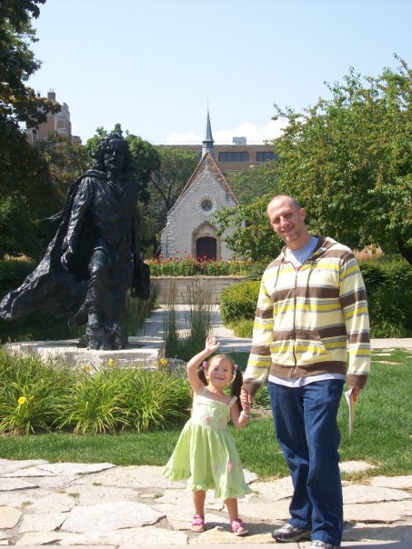 My daughter and I on the campus of Marquette University, in front of the statue of Father Marquette and the Saint Joan of Arc chapel.