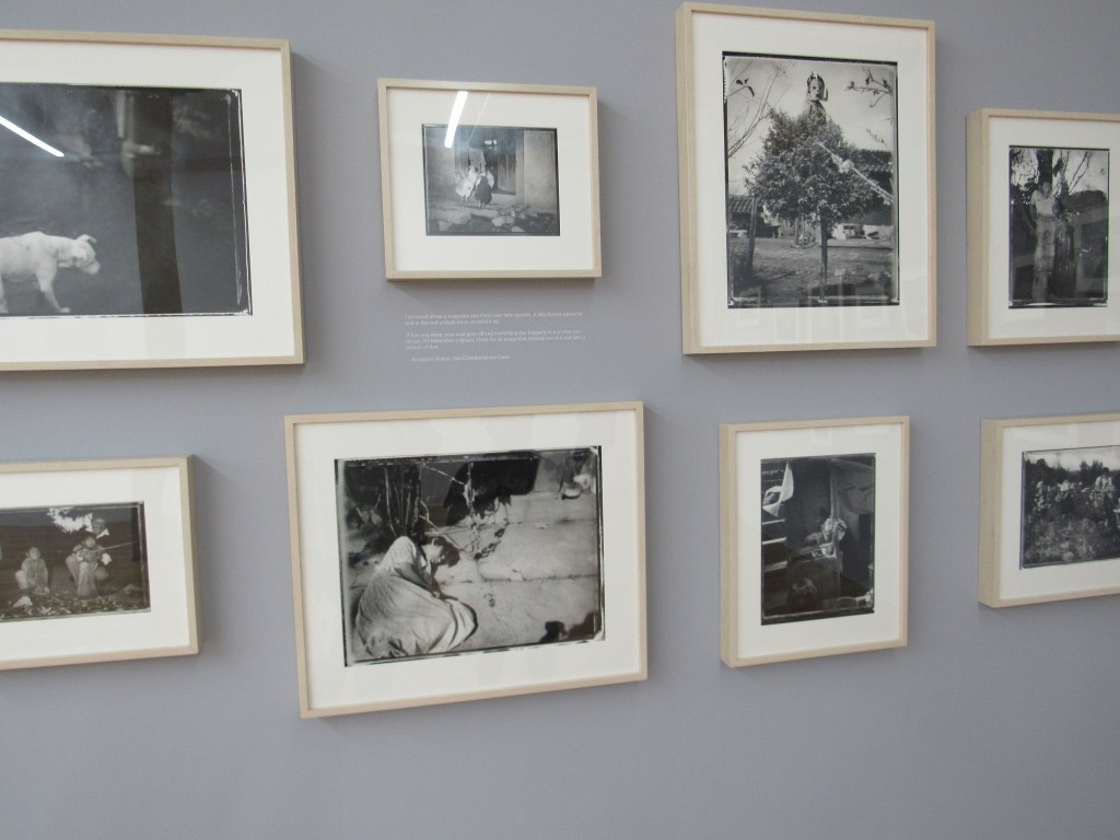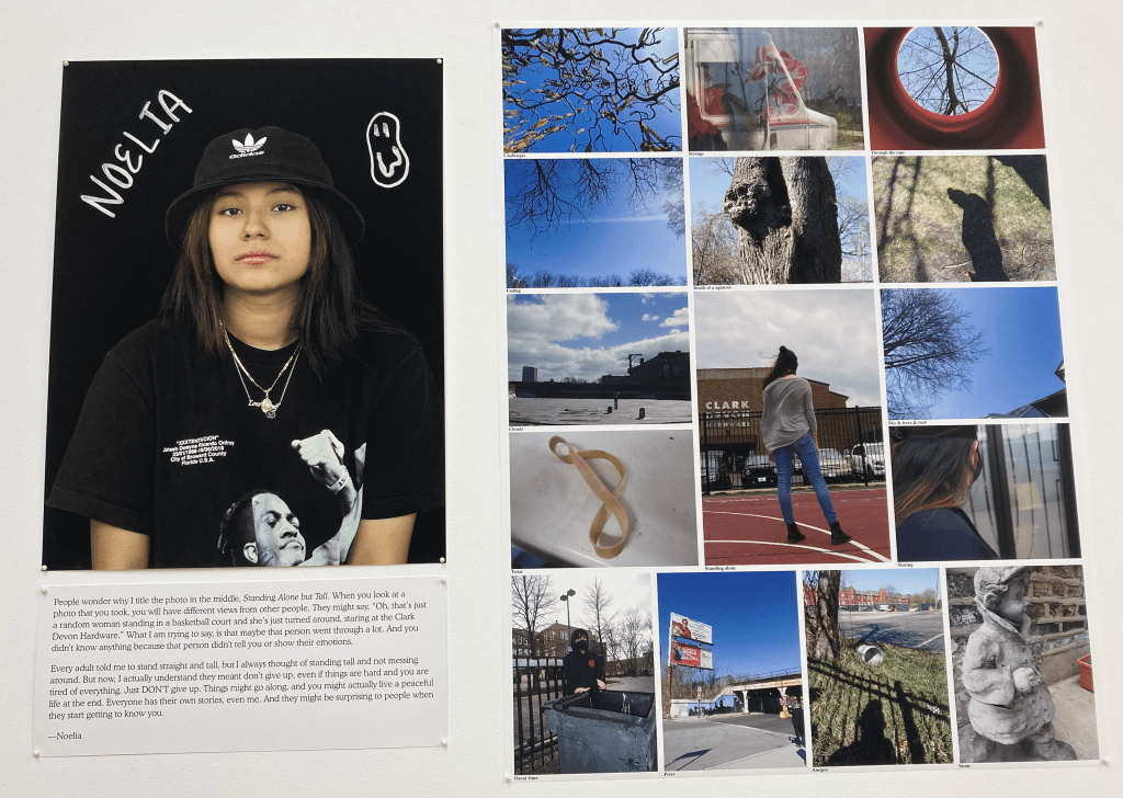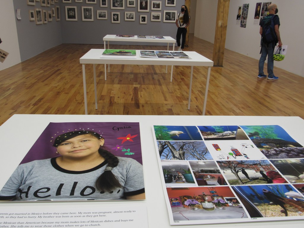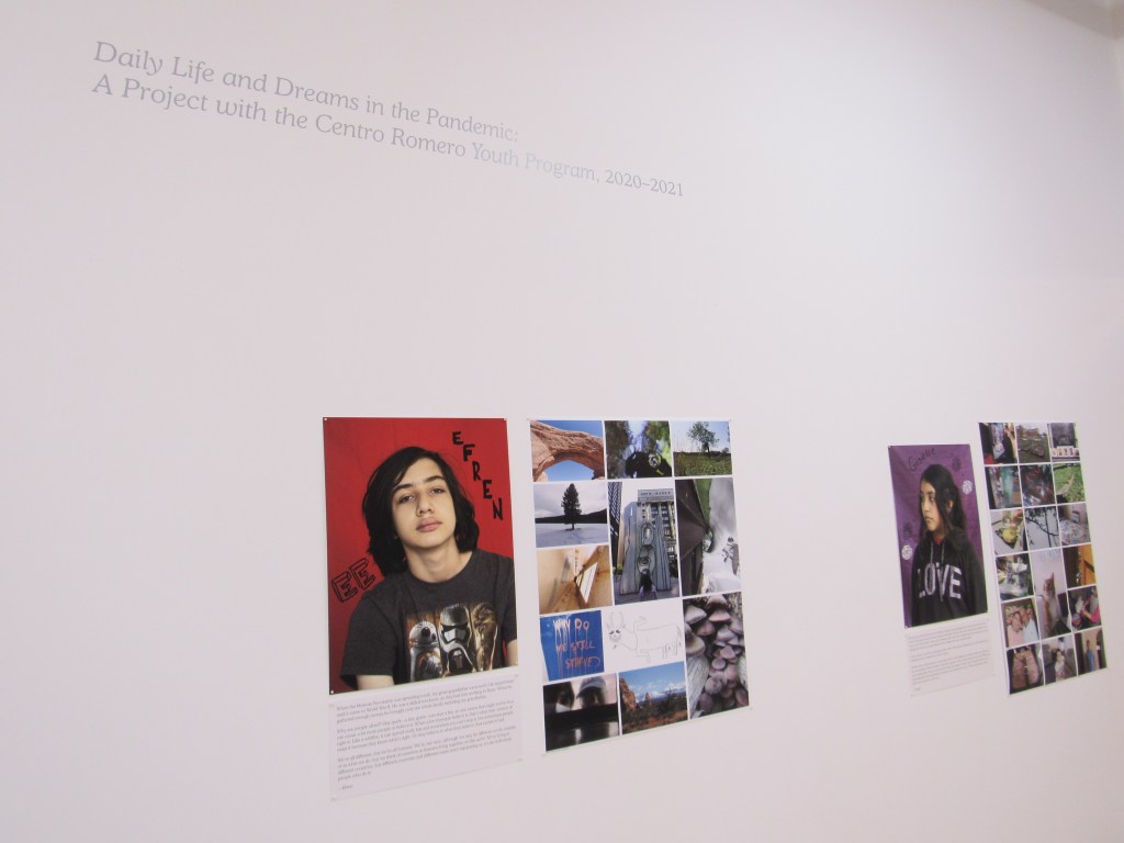 The section entitled “Daily Life and Dreams in the Pandemic: A Project with the Centro Romero Youth Program, 2020-2021” was perhaps the most eye-opening part of the exhibition for me, as fifteen young people, mostly from families of Mexican immigrants, were given tools and knowledge to document their day-to-day life and reflect on their dreams. Each contribution included a portrait of the artist in front of a background of a solid color with their hand-written first name (perhaps in maker), along with other small personal drawings that give us a small sense of what their personality and interests are. Some contributors, like Irving and Cyntia, are smiling, while others, like Kevin and Marestela, are serious. Some look directly at us, like Efren and Jeancarlo, while others like Naila and Zulairam are looking down or even off to the side, like Giselle and Itzel. All of them look perfectly natural, however, in that they didn’t attempt to get dressed up in fancy clothes. It doesn’t look like any are wearing makeup. Next to each portrait are a few paragraphs in which the artists comment on different aspects of their life, such as their family origins, the paths they’ve taken to where they are now, their artistic vision, their feelings about living in a pandemic, and their hopes for the future. Most write in English, while at least one, Angel, wrote in Spanish. Next to the portrait and brief essays, we see as many as 15 pictures taken by these youths.
