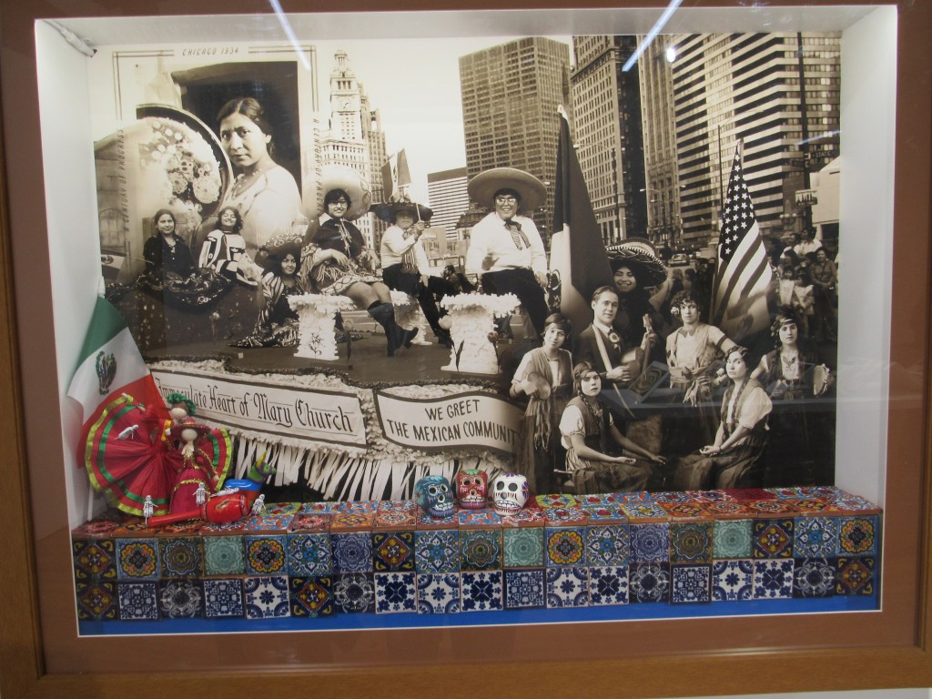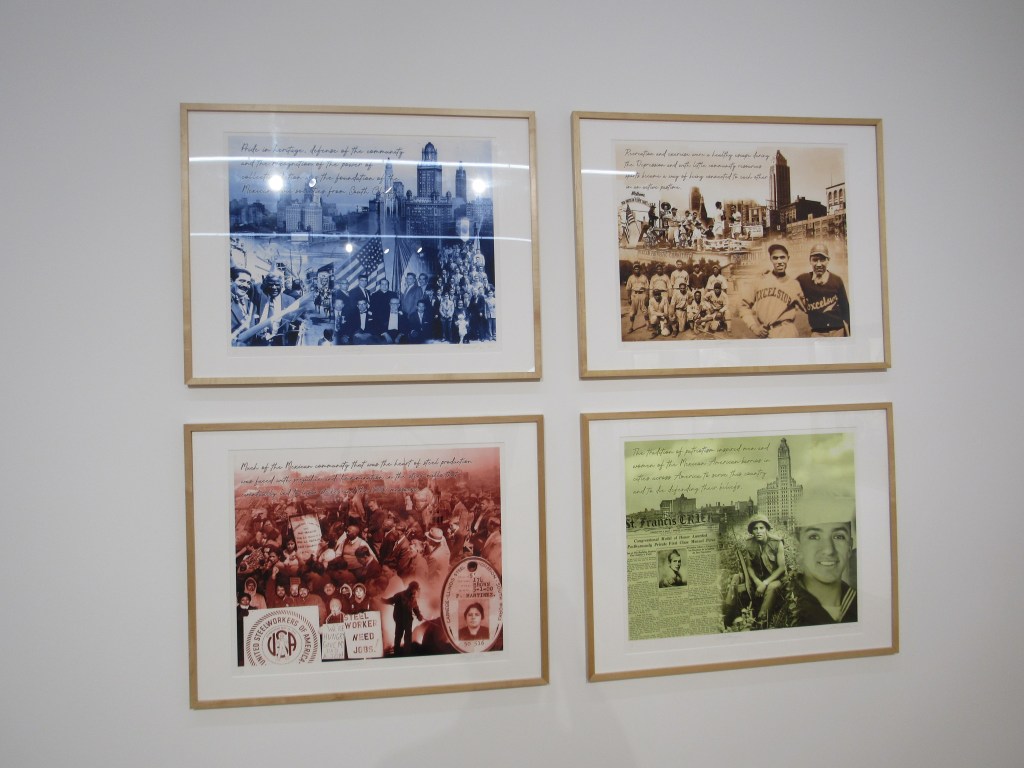The second gallery of the exhibition features a collection of works from Amalia Mesa-Bains called “Dos Mundos: Mexican Chicago, 2020-2021.” As the title suggests, many of these works mix different media together to tell the history of Mexicans in Chicago. Take for example the image below, which shows four different collages featuring images from, I’m assuming, the 1920s, 1930s, and 1940s. Each collage focuses on a different aspect of Mexican participation in the community – for instance, the military, sports, and industrialization – and include a sentence or two about it.