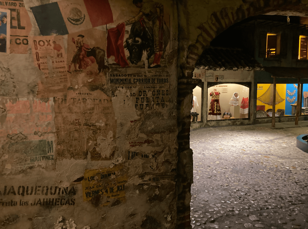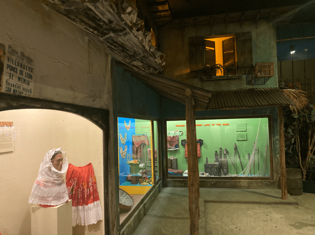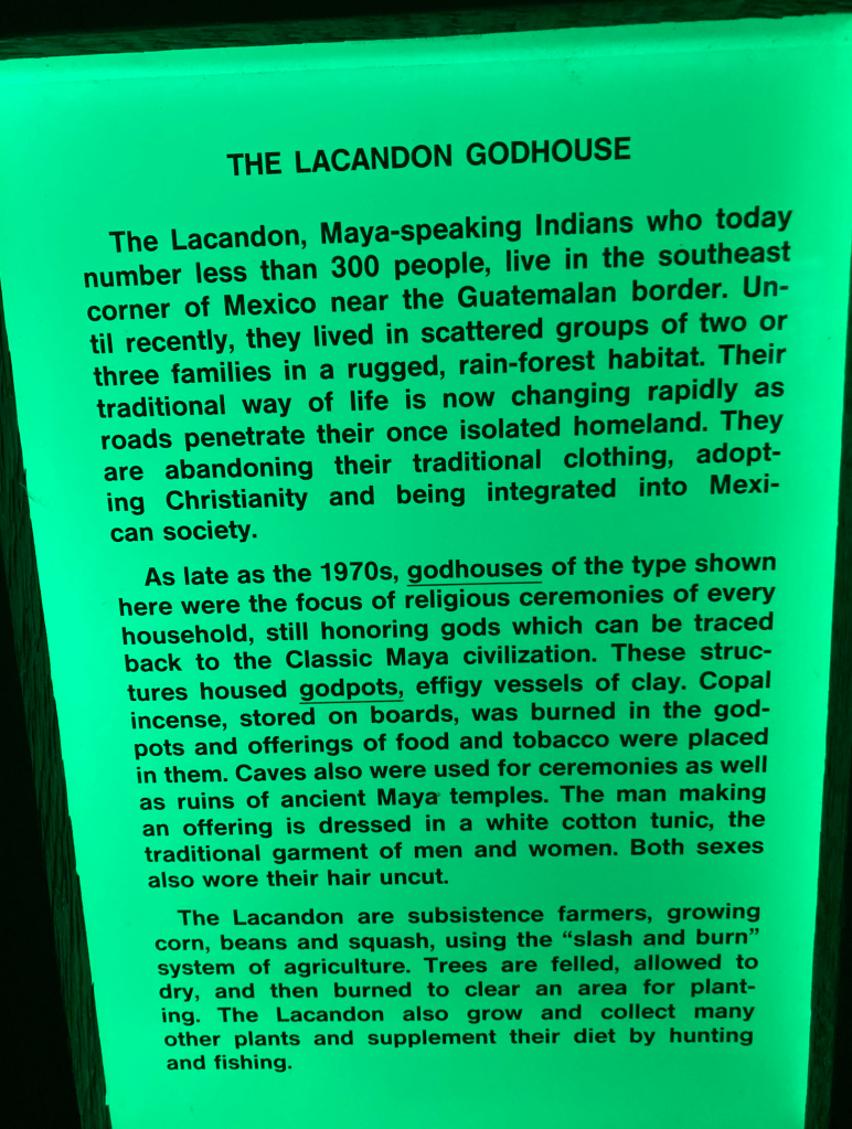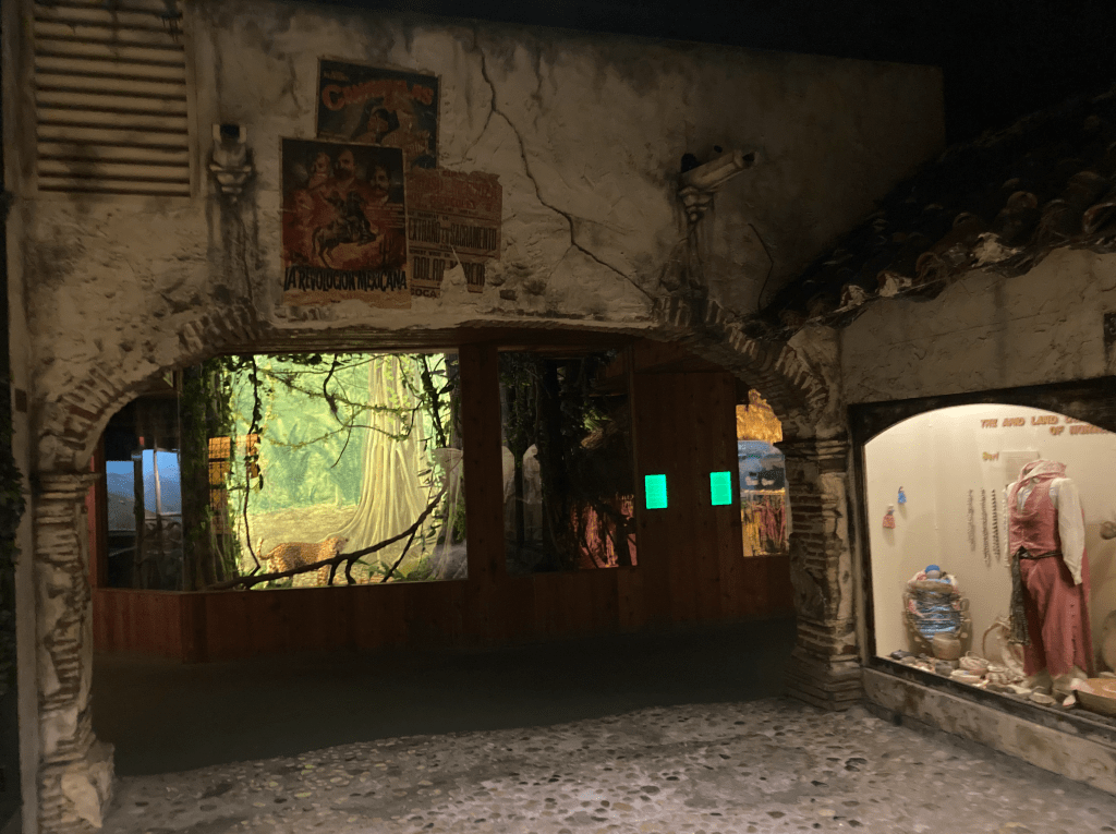 Near the market scene, there are scenes showing a Mexican plaza, Central American jungle, and a Lacandon Godhouse. The Mexican plaza is very attractive, as it features a cobblestone street, artificial (though lifelike) plants, a fountain, arches with artifacts from different Spanish-speaking countries, and walls with remnants of bullfighting posters. The music that can be heard is a mixture of songs featuring the marimba and others that sound reminiscent of what you would expect to hear at a bullfight. Of course, bullfighting is not a big part of modern Latin American culture, but these scenes, like the market scene, reflect earlier times or maybe even imagined times through the lens of the United States in the 20th century. Not all of the artifacts shown here are of equal value. I’m not sure, for example, why simple straw hats are included in one of the displays. Perhaps the scene here that is the most interesting is that of the Lacandon Godhouse. Although its representation is quite dark and a bit creepy, the description provided important aspects of the isolated, little known indigenous Landandon people.