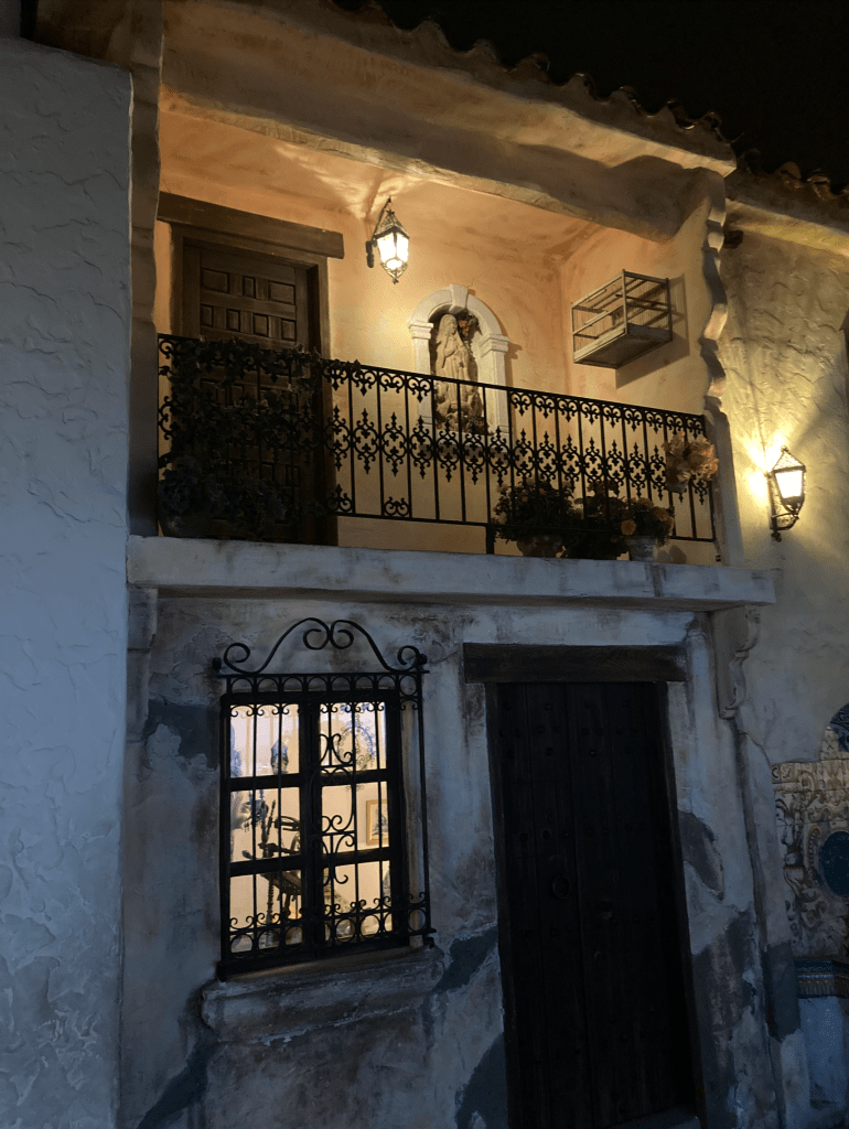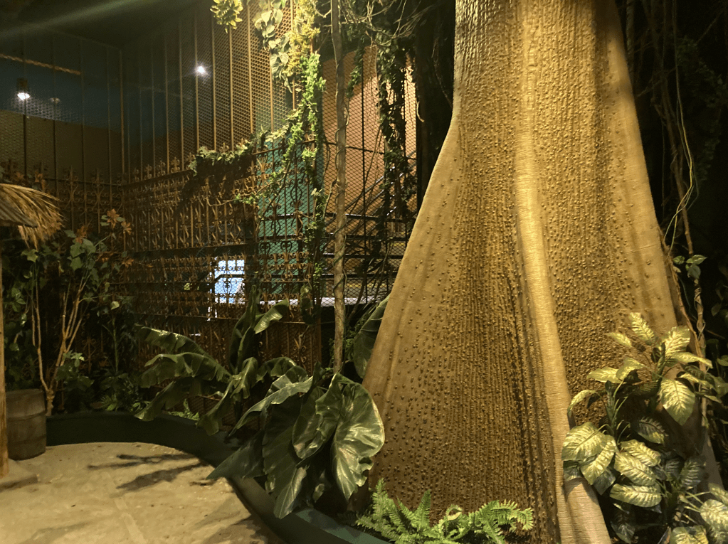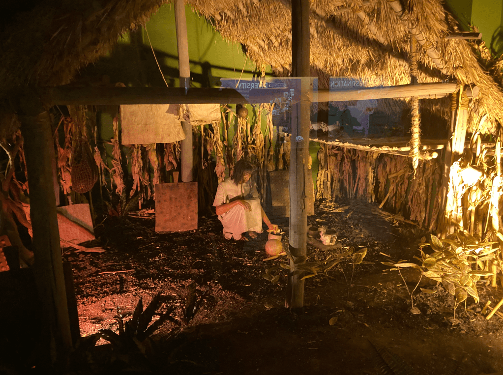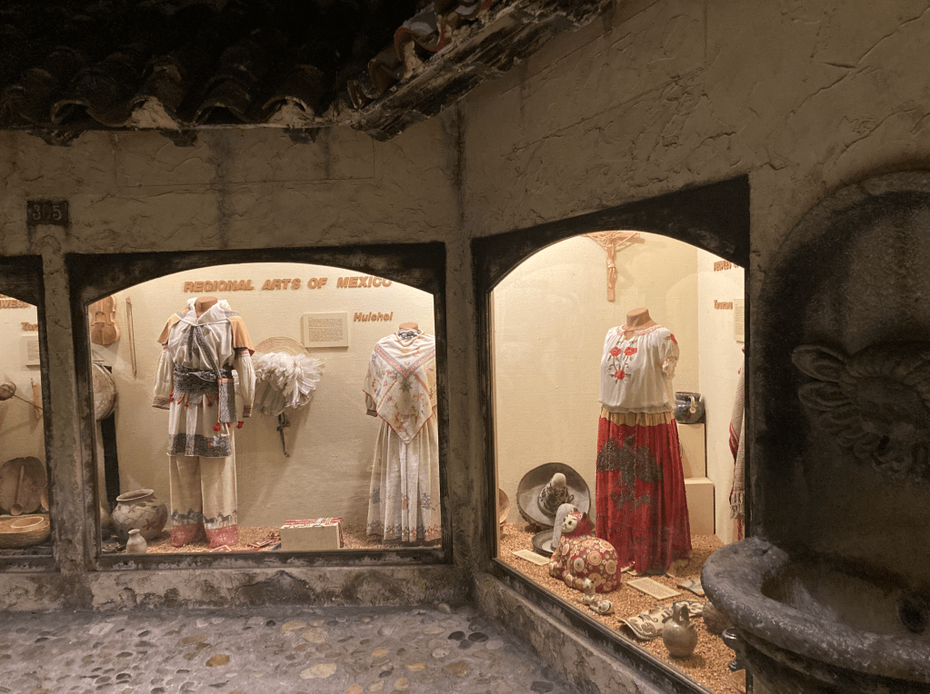 Near the market scene, there are scenes showing a Mexican plaza, Central American jungle, and a Lacandon Godhouse. The Mexican plaza is very attractive, as it features a cobblestone street, artificial (though lifelike) plants, a fountain, arches with artifacts from different Spanish-speaking countries, and walls with remnants of bullfighting posters. The music that can be heard is a mixture of songs featuring the marimba and others that sound reminiscent of what you would expect to hear at a bullfight. Of course, bullfighting is not a big part of modern Latin American culture, but these scenes, like the market scene, reflect earlier times or maybe even imagined times through the lens of the United States in the 20th century. Not all of the artifacts shown here are of equal value. I’m not sure, for example, why simple straw hats are included in one of the displays. Perhaps the scene here that is the most interesting is that of the Lacandon Godhouse. Although its representation is quite dark and a bit creepy, the description provided important aspects of the isolated, little known indigenous Landandon people.