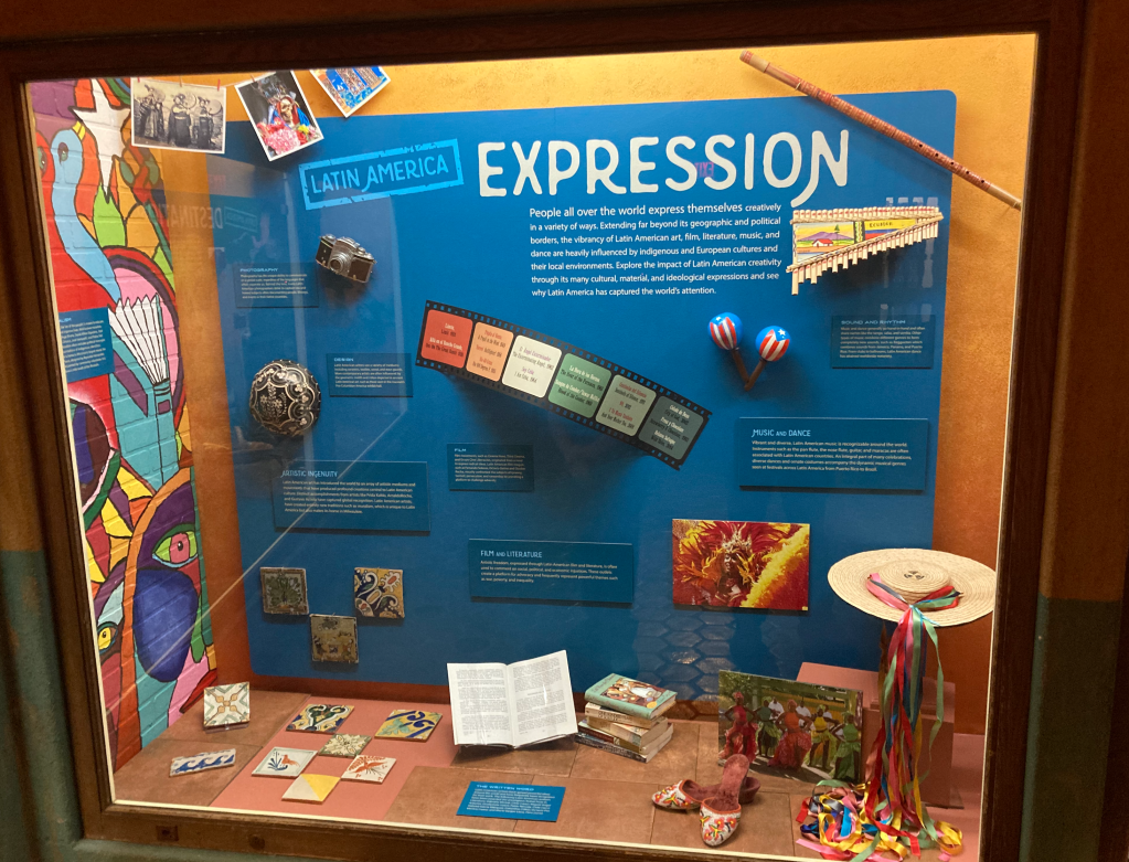 While the scenes of Latin American culture reflect the (perhaps imagined) past, there are some displays, just before the Lacandon Godhouse scene, that attempt to educate visitors on contemporary Latin America, as shown in the images below. Despite the relatively small amount of space they occupy, these displays, which were in all likelihood created several decades after the other aforementioned representations of Latin American culture, are important because they give a sense of the current diversity of cultural products, practices, and perspectives of the region.