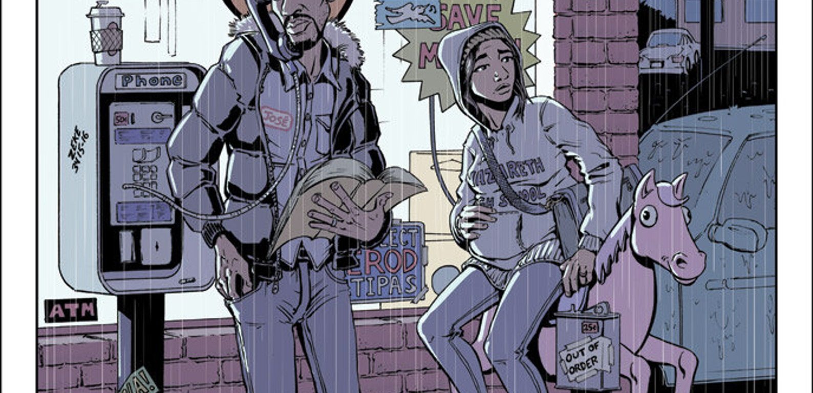 The colors are quite washed out, giving a pessimistic view to this unfortunate couple, who find themselves with nowhere to stay in the middle of a storm. The glimmer of hope, however, comes from the plant in between José and María, just starting to shoot through the crack in the sidewalk.