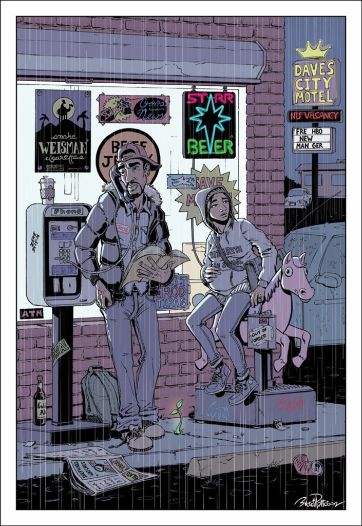 As you can see, it’s a re-envisioning of the birth of Jesus Christ, asking us to consider what Joseph and Mary might look like in today’s world. They are portrayed as Hispanic immigrants, with José using a public phone outside of a convenience store, probably looking desperately for somewhere to stay. It’s fun to notice at all the biblical references. Here are a few: María riding a mechanical horse and wearing a Nazareth High School sweatshirt; the words “word” and “flesh” written in graffiti under the horse; advertisements for “Weisman” cigarettes, “Good News” chocolate bars, and “Starr” beer on the window; the sticker of the dove on the window; the advertisements for “Shepard Watches,” “Glad” and “Tide” in the newspaper on the ground; the crown over Dave’s City Motel in the distance, along with the missing A from “manager,” creating the word “manger.” There are a few others that I haven’t mentioned, but Patterson refers to them on his page.