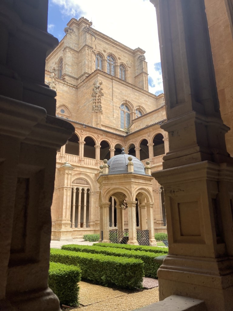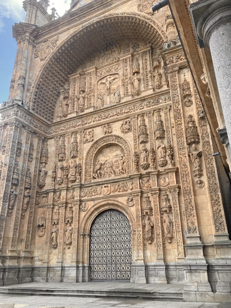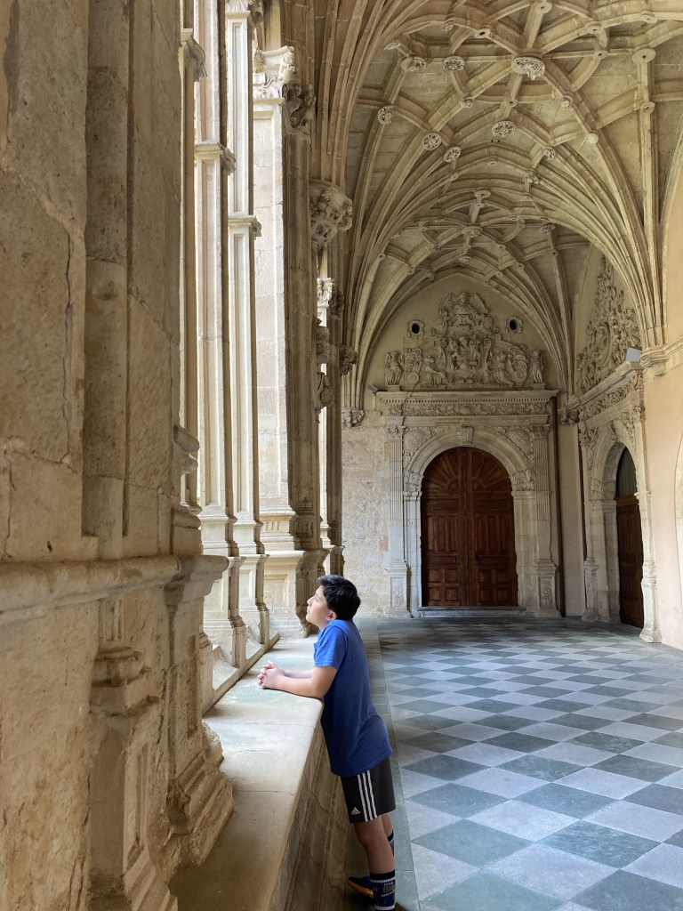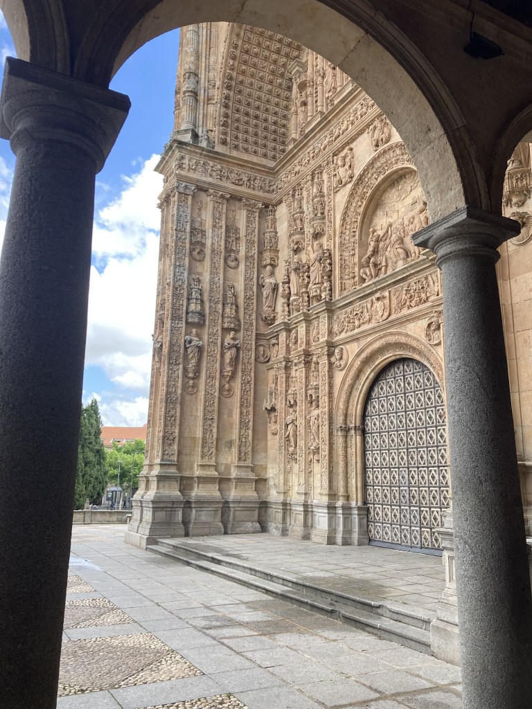 The monastery we visit today, built over the old one, was a collaborative effort, on which some of the most heralded Spanish architects and sculptures worked throughout the years, including Juan de Álava (1480-1587), Rodrigo Gil de Hontañón (1500-1577), and José Benito de Churriguera (1665-1725). The style of the intricate façade is plateresque, which is so decorative, detailed, and even flamboyant, that I can’t help but wonder why it went out of style after the Renaissance. I mean, I understand that trends come and go, but I question whether it is even possible for architects and artisans to imitate this movement today. Many of the ornate details of the Sagrada Familia church in Barcelona were created in the last century, of course, so the technology and workmanship can’t be the main issues. I suppose it could be that the Spanish Golden Age architects were profoundly inspired by God in a way that modern architects are not. But I digress; I’ll ask whoever runs an architectural blog to pontificate on such matters.