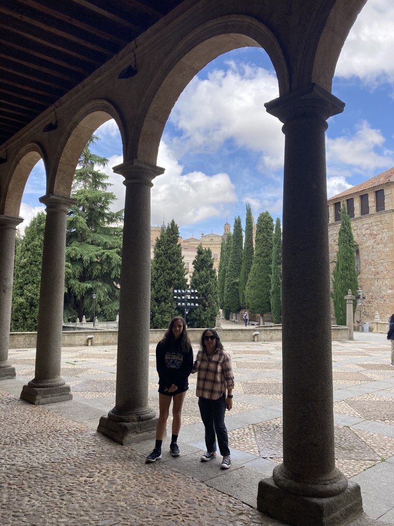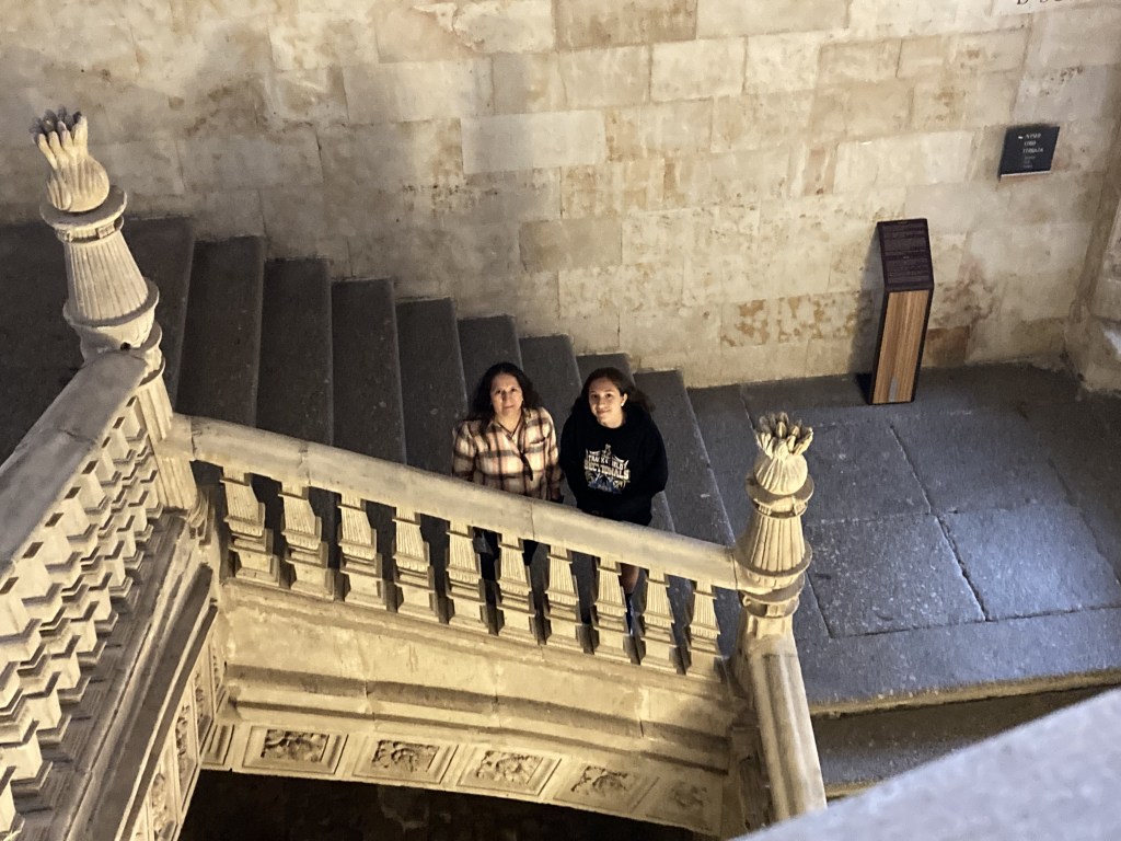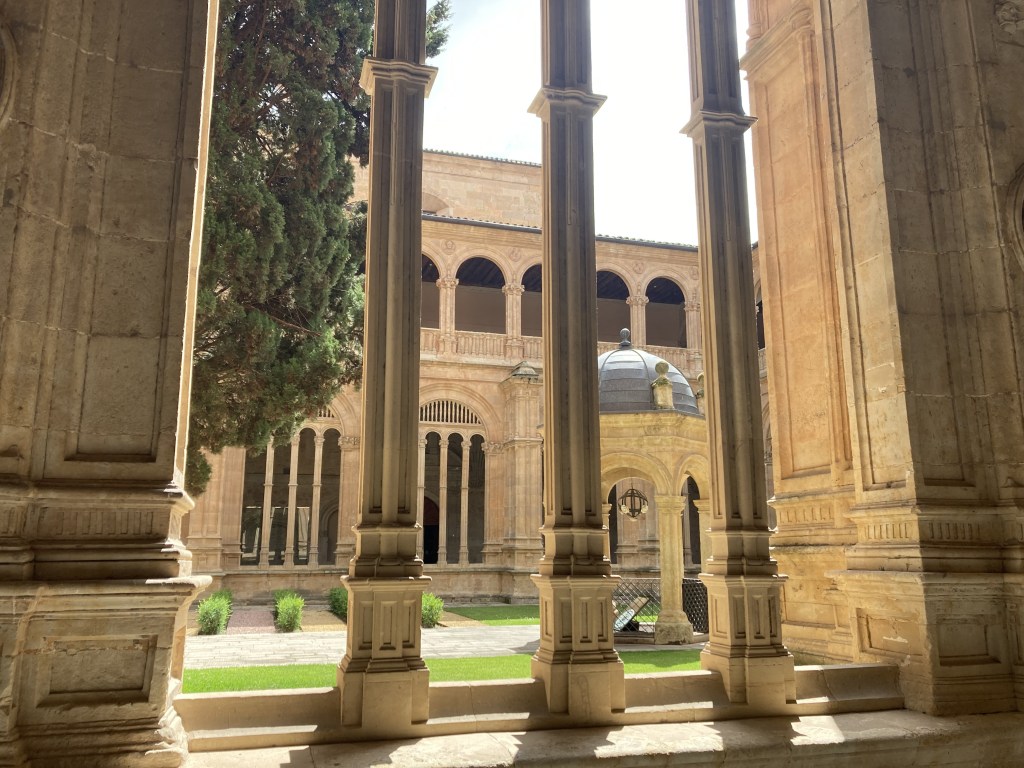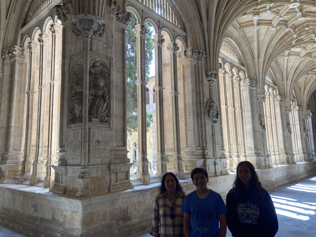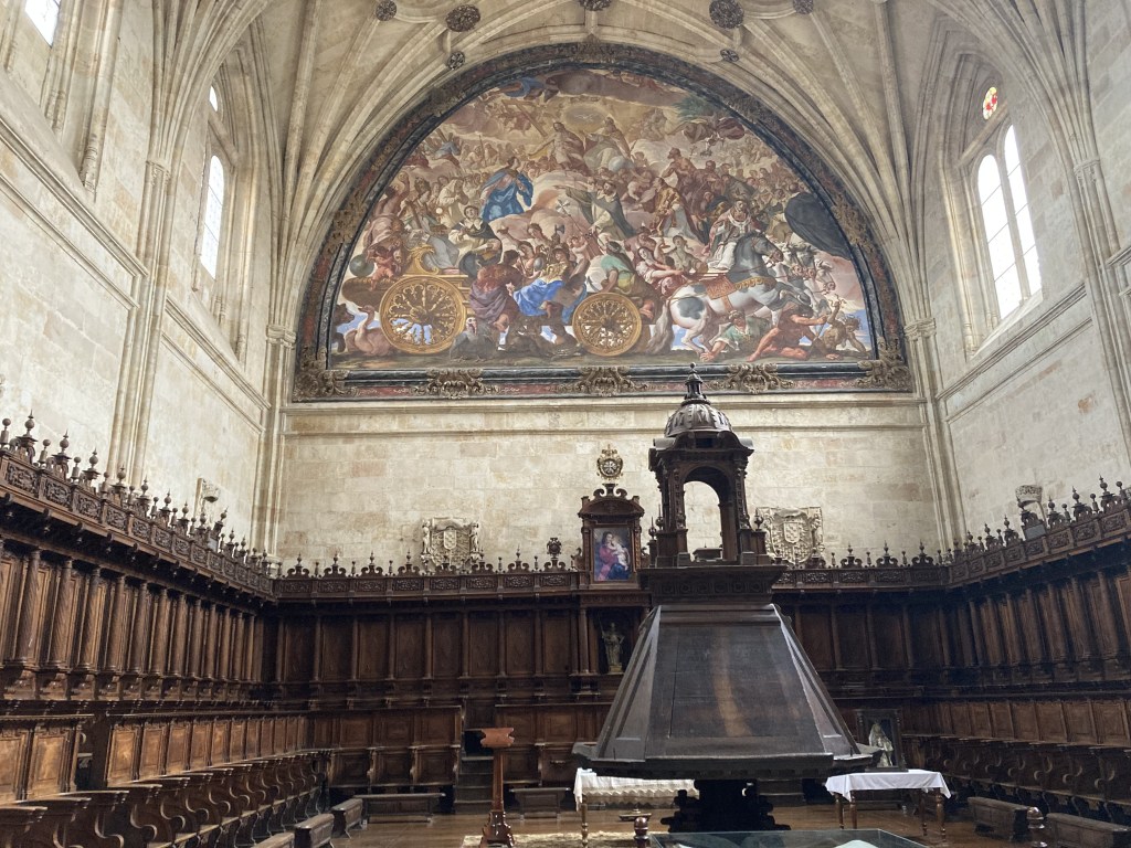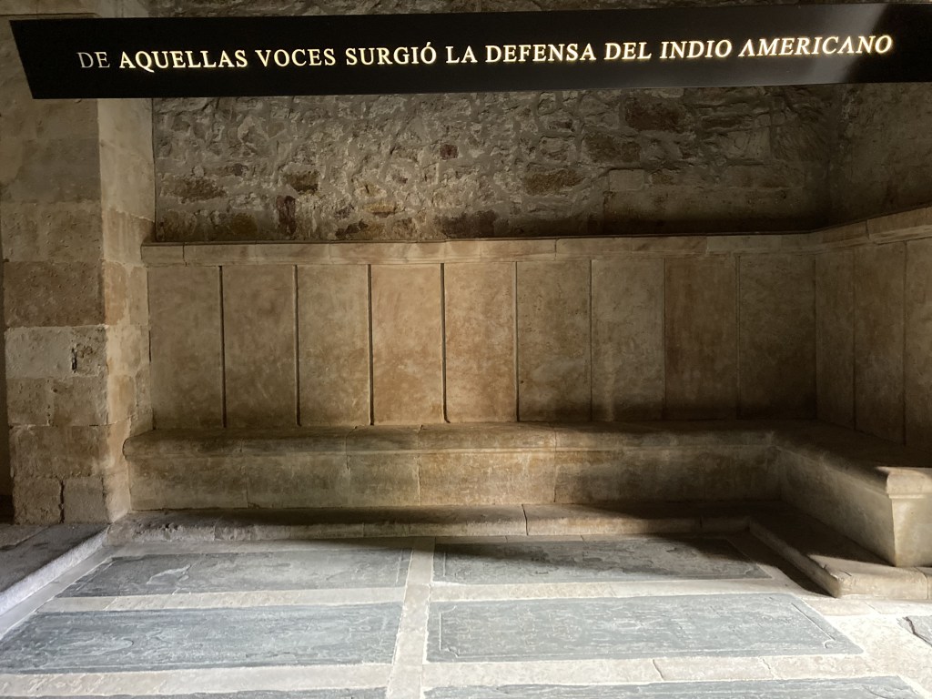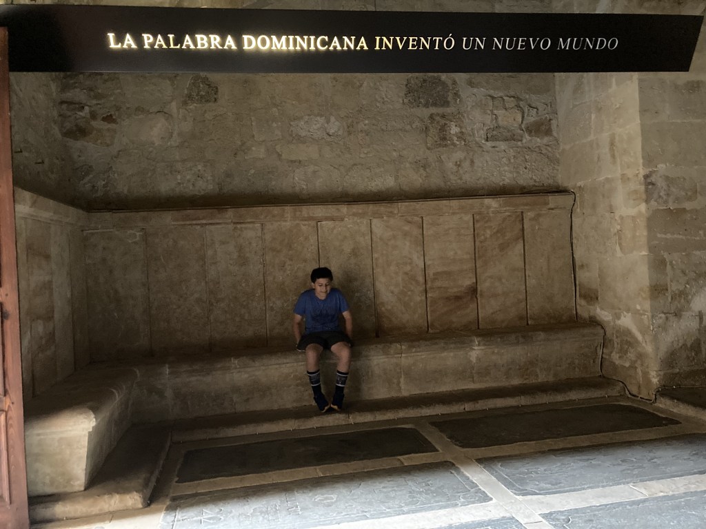 As I walked to the main interior patio of the Convento de San Esteban, I was in awe. Not only are the architectural details exquisite to behold, but the feeling you get in the extremely quiet space, touching stone columns that are hundreds of years old, walking where people like Saint Teresa of Ávila and Saint Ignatius of Loyola have walked… I can only describe it as a profound reverence. There are various rooms around the patio that lead the visitor to learn about the history of the monastery. One such room is very dark, but you can make out the tombs of permanent residents of the monastery on the floor you walk. There are built-in stone benches on each side, and there’s an almost eerie recording of a narrator explaining that in rooms such as this, the monks would meet to discuss the evangelization of the indigenous American peoples. The narrative that is underlined throughout the monastery is that the Dominicans defended the rights of these people; they did not consider them to be soulless savages, as other people of the time contended. There seems to be a real concerted effort here to counter the popular narrative we hear so often today that those Spanish missionaries forced the natives to convert and mistreated them.