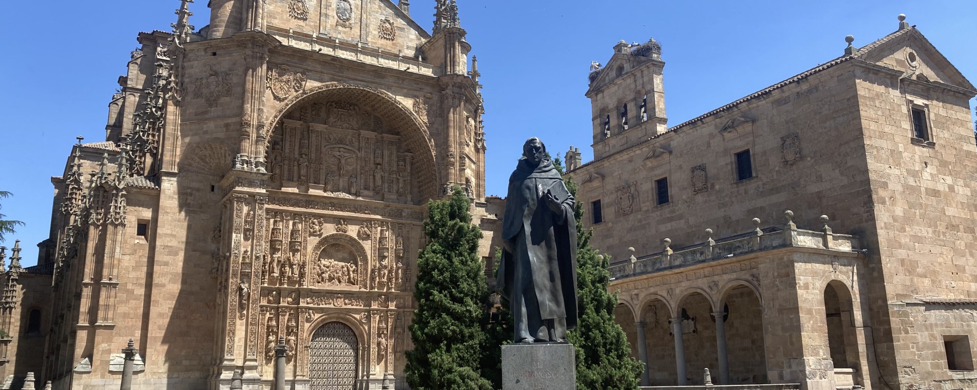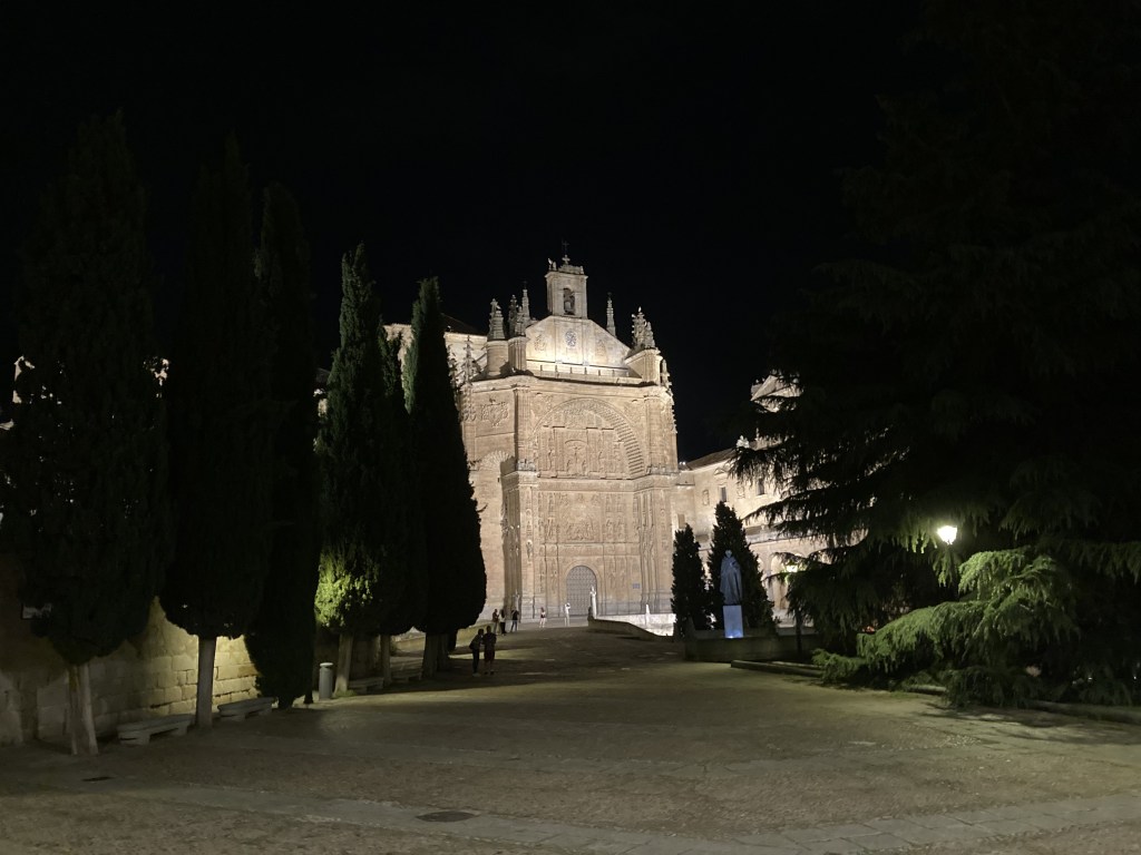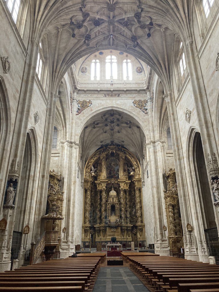 Out of all the cathedrals and other religious places I’ve visited in Spain, there are a few that stand out as truly exceptional to me, although they all are breathtaking in their own right. One such standout location is the Convento de San Esteban in Salamanca. The monastery we see today, home to the local Dominican monks, commenced construction in the early 16th century, and it was built over the original monastery, where, they say, Christopher Columbus stayed for a time to discuss his navigational plans to sail west, all the way to the Indies, in his meetings with renowned geographers at the nearby Universidad de Salamanca and friars at the monastery.